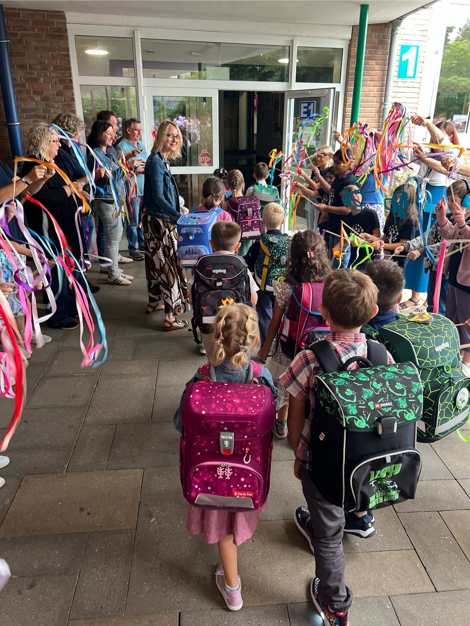 Die Feier fand auf dem Schulhof statt, der liebevoll geschmückt war. Eltern, Großeltern und Geschwister konnten sich über ein abwechslungsreiches Begrüßungsprogramm freuen, das von den 3. Klassen mit viel Engagement vorbereitet wurde. Es gab ein spannendes Trommelstück, fröhliche Lieder und ein Gedicht, das den Schulanfang auf ganz besondere Weise beschrieb. Nach dem Programm wurden die Kinder von ihren Klassenlehrerinnen in Empfang genommen und durften ihre erste Unterrichtsstunde im neuen Klassenraum erleben – ein aufregender Moment!