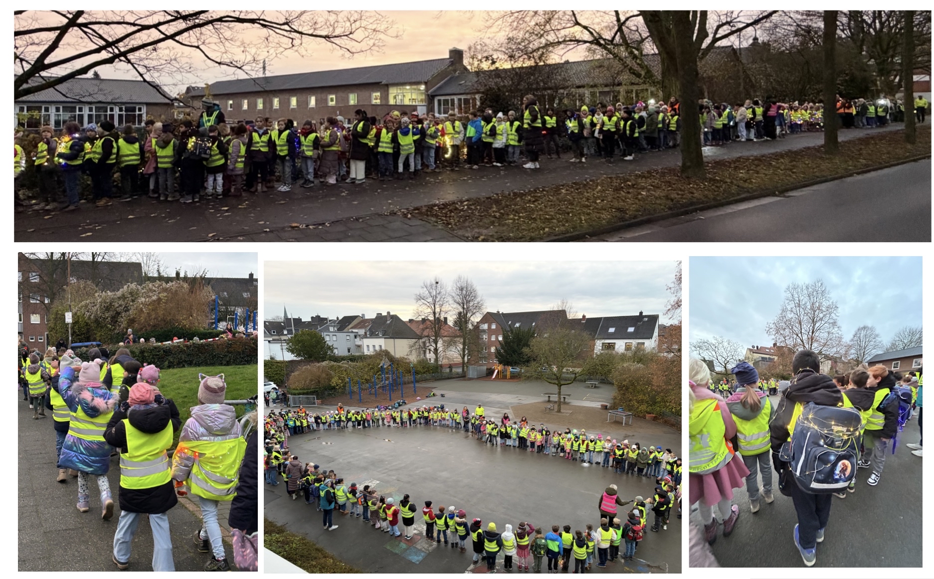 Am 03.12.25 kamen die Schülerinnen und Schüler gut sichtbar und leuchtend zur Schule – mit Warnwesten, leuchtenden Mützen oder Lichterketten. Gemeinsam liefen sie als großes „Glühwürmchen“ einmal um das Schulgelände und machten so auf die Bedeutung von Sichtbarkeit im Straßenverkehr aufmerksam.