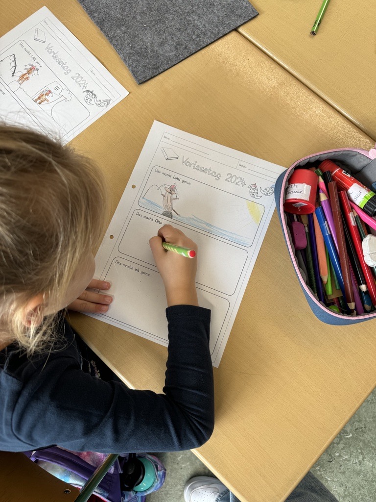 Schon zu Beginn des Tages war die Aufregung groß. In jeder Klasse warteten spannende Bücher und kreative Aktivitäten, die das Lesen noch lebendiger machten. Die Lehrerinnen und Lehrer lasen vor, und die Kinder konnten sich in fantasievolle Welten entführen lassen. Um das Erlebnis noch gemütlicher zu gestalten, brachten viele Schülerinnen und Schüler ihre Kuscheldecken und Kuscheltiere mit, um sich während der Vorlesezeit richtig einzukuscheln. Inmitten von flauschigen Decken und den vertrauten Begleitern wurde das Lesen und Vorlesen zu einem rundum entspannten und genussvollen Erlebnis. Es wurden nicht nur bekannte Klassiker vorgelesen, sondern auch moderne, aufregende Geschichten, die zum Mitdenken und Miträtseln einluden. In vielen Klassen hatten die Kinder anschließend die Möglichkeit, zu den gelesenen Geschichten eigene Bilder zu malen und zu gestalten. Es wurden Szenen aus den Erzählungen gemalt, Charaktere und Orte zum Leben erweckt, was nicht nur die Kreativität förderte, sondern auch das Verständnis für die gelesenen Inhalte vertiefte.