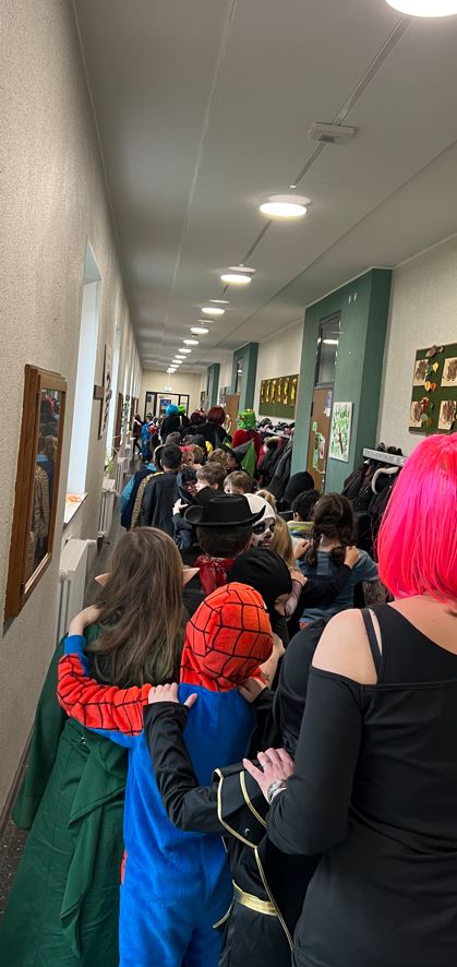 Nach der tollen Darbietung verweilte die Schulgemeinde noch etwas in der Turnhalle und es war Zeit die einzelnen Kostüme zu würdigen und zu feiern. Mit Musik und einer langen Polonaise durch die ganze Schule wurden die Kinder in eine weitere Pause auf den Schulhof geführt, nach der der jecke Schulvormittag leider schon wieder zu Ende ging.