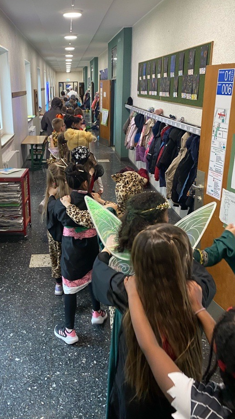 Nach der tollen Performance wurde in den einzelnen Klassen weitergefeiert, gespielt, gelacht und gegessen. Doch das war noch nicht das Ende! Zum krönenden Abschluss des Karnevals fand die traditionelle Polonaise durch das gesamte Schulgebäude statt, bei der alle Schülerinnen und Schüler zusammen mit den Lehrerinnen und Lehrern fröhlich durch die Schule tanzten.