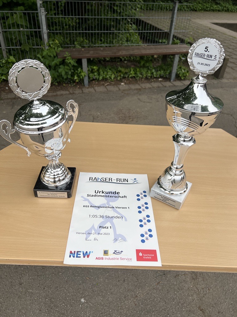 Und tatsächlich: Bei bestem Laufwetter konnten die Schul-Stadtmeister-Titel der Mädchen der Primarstufe sowie der Sonderpreis der teilnehmerstärksten Schule verteidigt werden und wie bereits im vergangen Jahr erneut zwei Pokale mit zur Remigiusschule genommen werden. Sagenhafte 122 Kinder unserer Schule, also mehr als 50%, haben sich angemeldet, für die Remigiusschule zu laufen – sensationell!