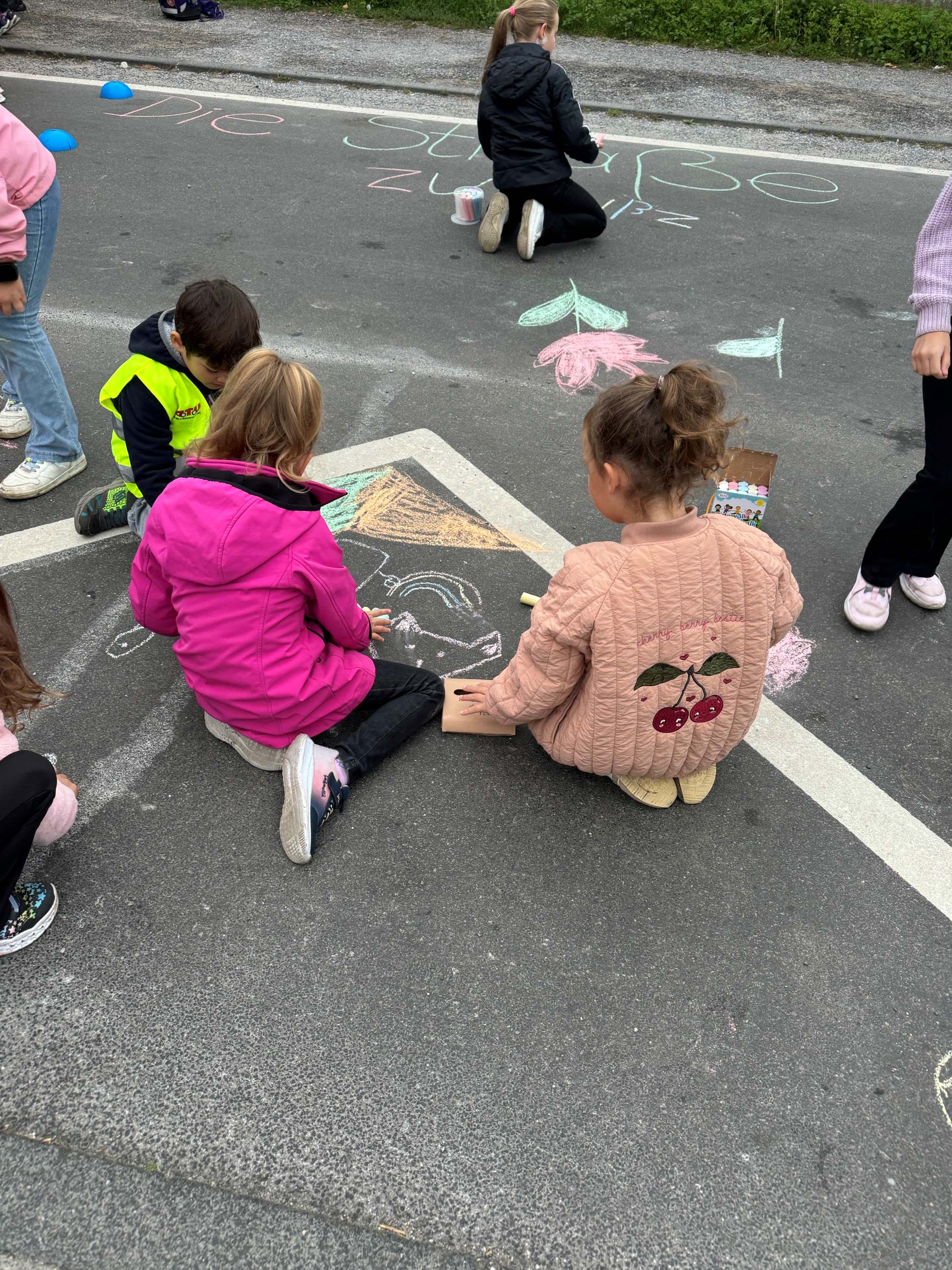 Einmalig für diesen Tag wurde ein Teil des Portiunkulawegs gesperrt und zur Schulstraße ernannt. Schon am frühen Morgen durften die Kinder auf der gesperrten Straße vor der Schule spielen. Auf der Straße durfte zu lauter Musik mit Kreide gemalt, Seilchen gesprungen, Roller gefahren oder mit dem Schwungtuch gespielt werden. Der offene Anfang wurde dabei etwas ausgedehnt, sodass die Kinder einen bunten und lustigen Tag in den Start hatten. Auch am Schulvormittag hatte dann jede Klassenstufe nochmal die Möglichkeit, die Straße zum Spielen zu nutzen. Als Überraschung für die vielen gesammelten Sterne der letzten Wochen (Sterne für zu Fuß kommende Kinder), spendierte der Förderverein allen SchülerInnen ein Eis. Die Eismanufaktur Delikat aus Viersen beehrte uns erneut und brachte leckeres Eis mit. Die Kinder freuten sich sehr über diese Überraschung und über den Tag mit vielen Möglichkeiten zum Spielen. Toll was alles möglich ist, wenn die Straße sicher und frei von Autos ist.