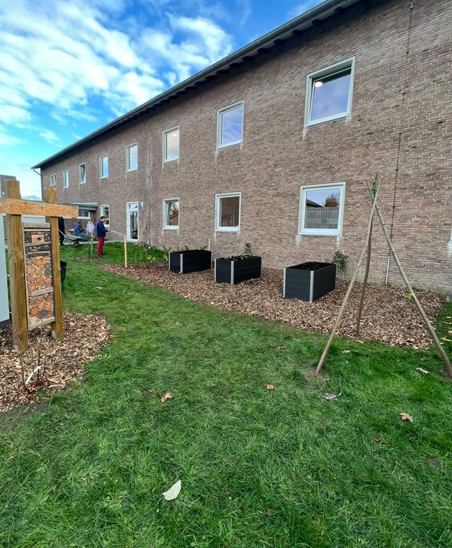 Mit seiner kompetenten Unterstützung und Beratung, entstand ein toller Außenbereich, mit drei Hochbeeten, mehreren Obststräuchern und –bäumen sowie einem Insektenhotel.